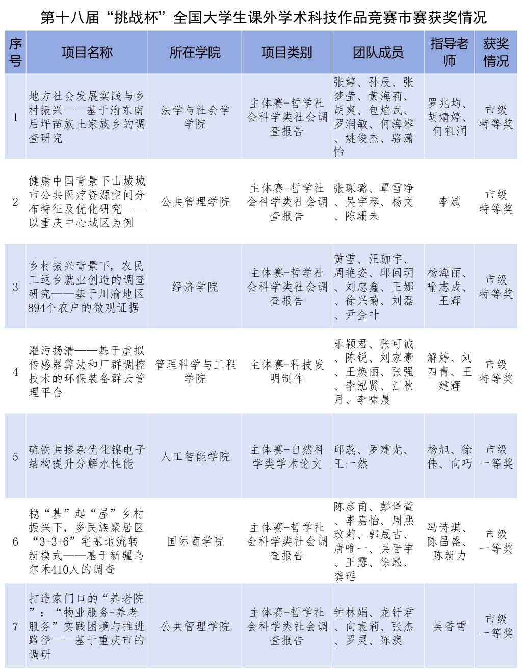 在重庆市选拔赛中,威尼斯官网同样取得佳绩,荣获市级奖项27项。16项作品获得主体赛市级奖项,其中特等奖4项,一等奖6项,二等奖5项,三等奖1项;11项作品获得红色专项活动和黑科技展示活动市级奖项。校团委获评优秀组织奖,王建辉等13名老师荣获优秀指导教师,校团委袁影老师荣获先进工作者。威尼斯官网市赛获奖数量及等次较上届大幅提升,位居重庆市高校前列。
