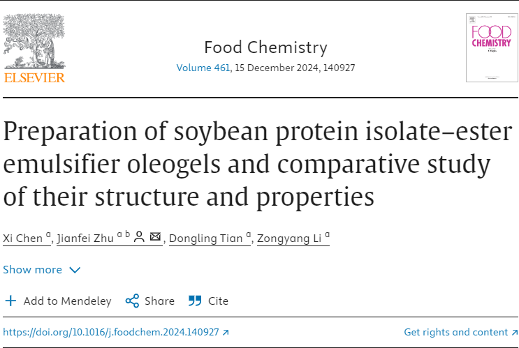 近日,威尼斯官网食品科学与工程学院2022级食品科学专业硕士研究生陈爔,在导师朱建飞副教授的指导下,在食品领域国际期刊《Food Chemistry》发表了题为“Preparation of soybean protein isolate–ester emulsifier oleogels and comparative study of their structure and properties”(大豆分离蛋白-酯类乳化剂油凝胶的制备及其结构与性质比较研究)的研究论文。
